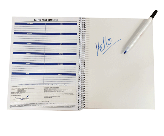 Laminated whiteboards are available as an optional extra. The whiteboards are available in various sizes to fit the student planner page size. The whiteboards are laminated on two sides. School content can be printed on the whiteboard. When used with non-permanent markers students can clean and reuse the whiteboard for class activities.